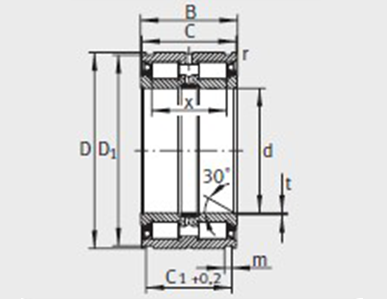 询价 半定位轴承型号 定位轴承型号 浮动轴承 型号 型号按照 DIN5412 质量 m ≈kg 尺寸mm 安装尺寸mm 基本额定载荷N 疲劳极限载荷Cur/ N 极限转速nG /min–1 参考转速nB /min–1