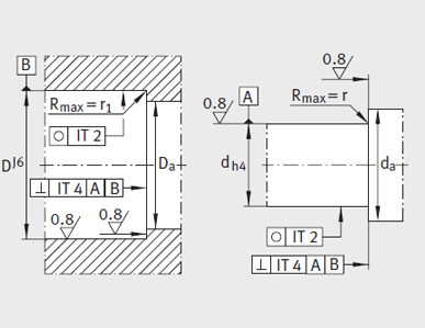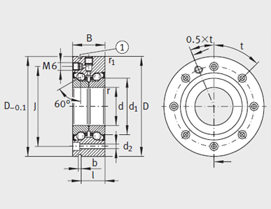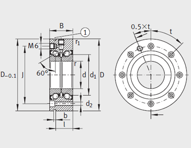 询价 型号 质量m ≈kg 尺寸mm 安装尺寸mm 固定螺栓1) DIN912-10.9 角度 t 数量×t 基本额定载荷 轴向 极限转速 nG脂 min–1 轴承 摩擦 力矩 MRL Nm 刚度 轴向 CaL N/μm 倾覆 刚度 ckL Nm/ mrad 质量 惯性矩2) Mm kg · cm2 轴向 跳动5) μm 锁紧螺母,需单独订购